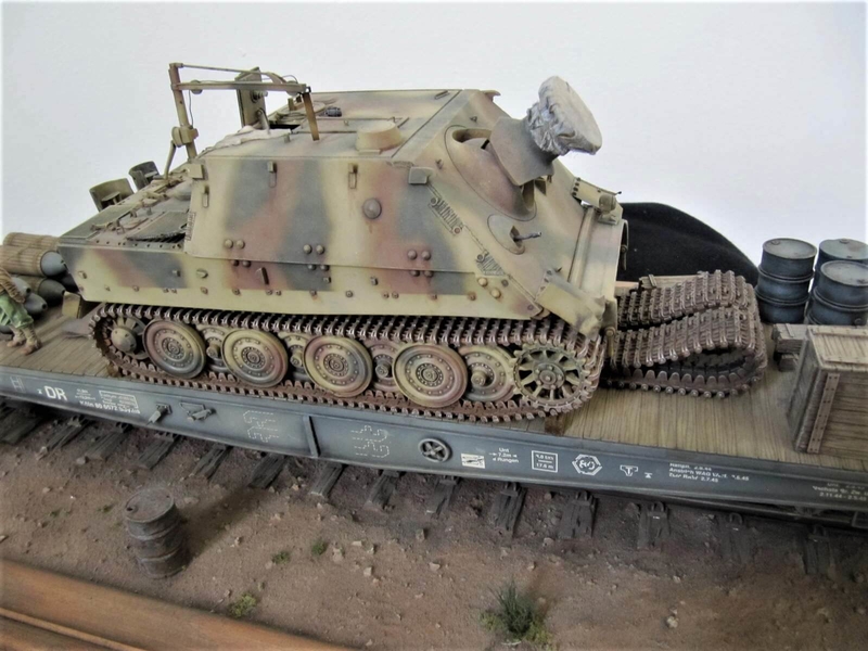 Ce diorama représente un sturmtiger (N.K.C en résine ) sur un wagon (ironside) . Les figurines sont des Verlinden , A.D.V. et une Andréa .